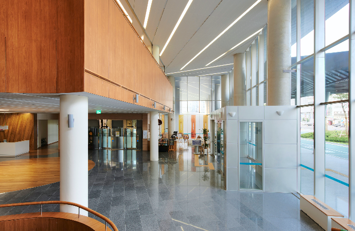 도심 외곽의 아름다운 자연 속, 야트막하게 자리잡은 대구산재병원은 대지에 잘 순응한 배치를 통해 대지의 특성이 내부 공간으로 연속돼 나타나고 있다. 외기에 면한 내부 공간은 밝은 실내 환경을 조성해 환자에게 재활의 의지를 고취하고, 정형의 차분한 외관 디자인은 바위의 모습을 형상화한 수중재활센터의 비정형적 디자인과 좋은 대조를 이루고 있다. 병원도 기본적으로 사람이 살아가는 장소라는 생각과 환자의 정서를 보듬는 배려를 통해, 인간의 부족함과 고통을 이해하고 위로해주는 공감의 디자인으로 완성했다.