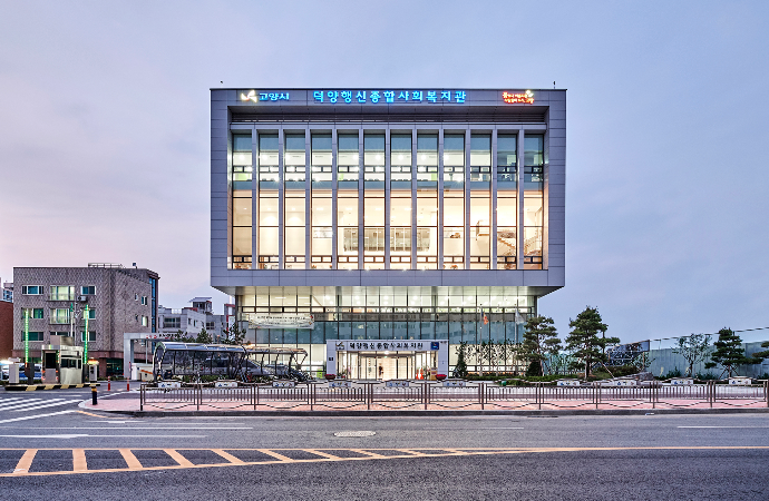 행신 종합사회복지관은 국내 최대 규모로 건립된 종합사회복지관으로, 지역사회의 소통과 교류의 거점이 되는 장소이다. 풍부한 내, 외부의 모임장소와 행사를 위한 넓은 공간이 많이 필요한 시설인데, 대지의 형상이 좁고 길어 요구시설 면적을 배치하고 나면 외부공간으로 이용할 수 있는 대지가 극히 적은 면적으로 남게 되었다. 이러한 제약을 극복하는 것을 계획의 주안점으로 두고, 내부 공간을 유연하고 가변성있게 계획하였다. 외부에는 계단식 옥상정원을 계획하고, 내부에는 그랜드 계단을 구성하여, 한정된 조건에서 최대한의 소통이 이루어질 수 있도록 의도했다. 고양 600년을 준비하는 고양시의 문화와 복지의 패러다임을 보여줄 수 있는 폭넓은 소통과 교류의 공간이 되기를 희망한다.